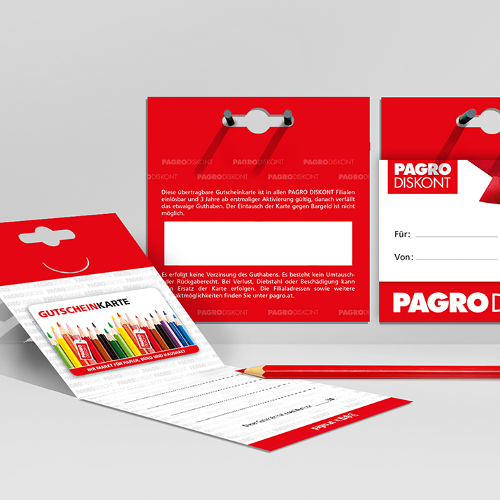 Für PAGRO DISKONT übernehmen wir fortlaufend die Produktion von Gutscheinkarten inklusive des passenden Trägerelements aus Karton – zuverlässig und pünktlich.